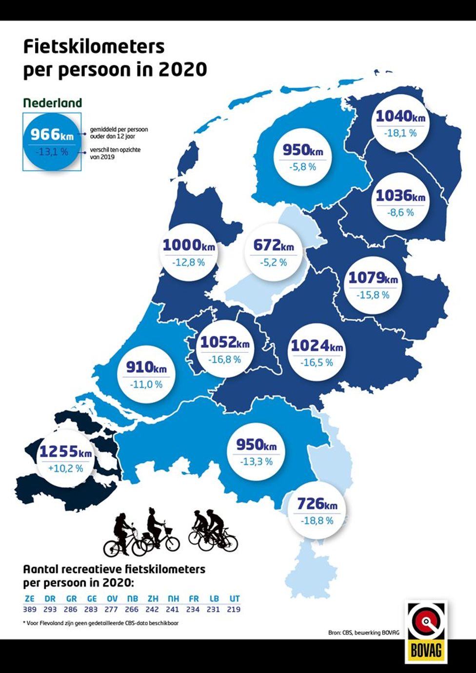 Op regionaal niveau zijn er grote verschillen in het fietsgebruik. Zeeland is de enige provincie waar de inwoners in 2020 meer kilometers fietsten dan in 2019; het gemiddelde aantal kilometers per persoon steeg daar met 10 procent tot 1.255. Daarvan waren 389 kilometers recreatief, eveneens het hoogste aantal van alle provincies. De inwoners van Flevoland fietsten vorig jaar in totaal slechts 672 kilometer, maar dat was van alle provincies met een min van 5 procent dan wel weer de kleinste daling ten opzichte van 2019. De inwoners van Noord-Holland fietsten vorig jaar 241 kilometers met recreatieve doeleinden en in Zuid-Holland was dat 242 kilometer, respectievelijk 61 en 55 procent meer dan in 2019. Van en naar onderwijs en opvang werd in Limburg vorig jaar slechts 52 kilometer gemiddeld per persoon gefietst, terwijl dat in Overijssel 130 kilometer per persoon was. In Drenthe werd vorig jaar 156 kilometer per persoon naar winkels gefietst, in Limburg slechts 82.