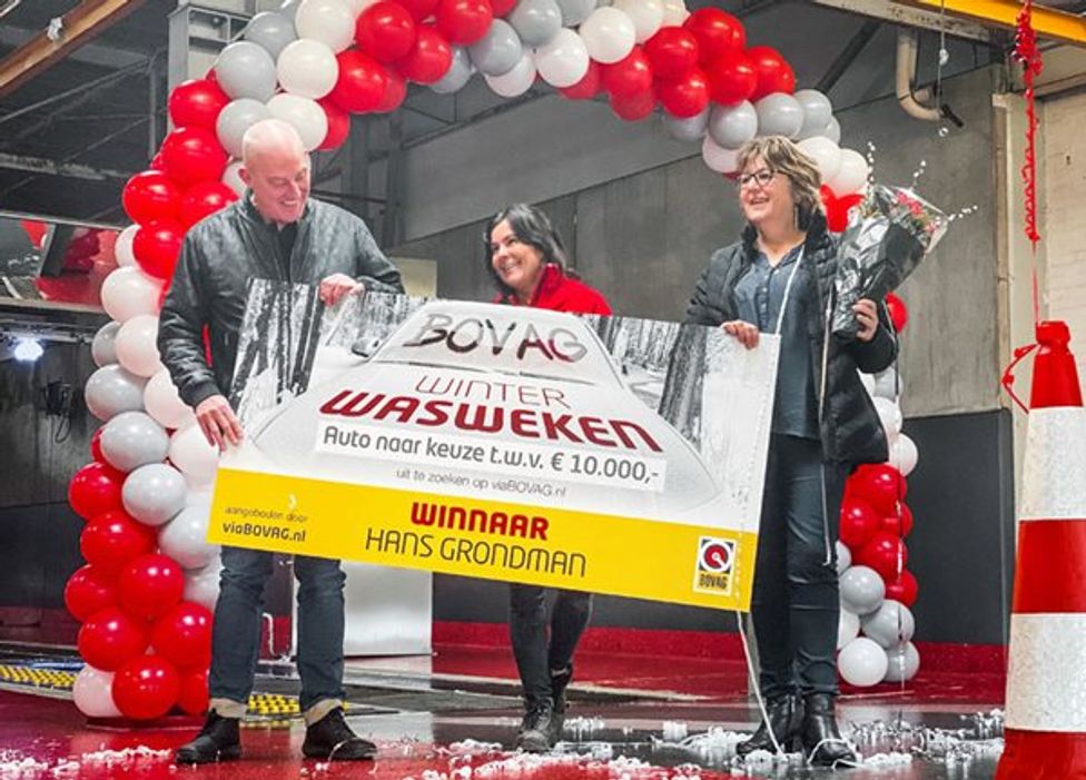Hans Grondman heeft de hoofdprijs gewonnen tijdens de WinterWasWeken: een cheque ter waarde van € 10.000, waarmee hij een auto mag uitzoeken op viaBOVAG.nl. Grondman heeft in de maand januari zijn auto gewassen bij BOB Autowas in Amsterdam en viel daarmee in de prijzen. Samen met zijn vrouw nam hij de cheque dinsdag 25 februari in ontvangst.