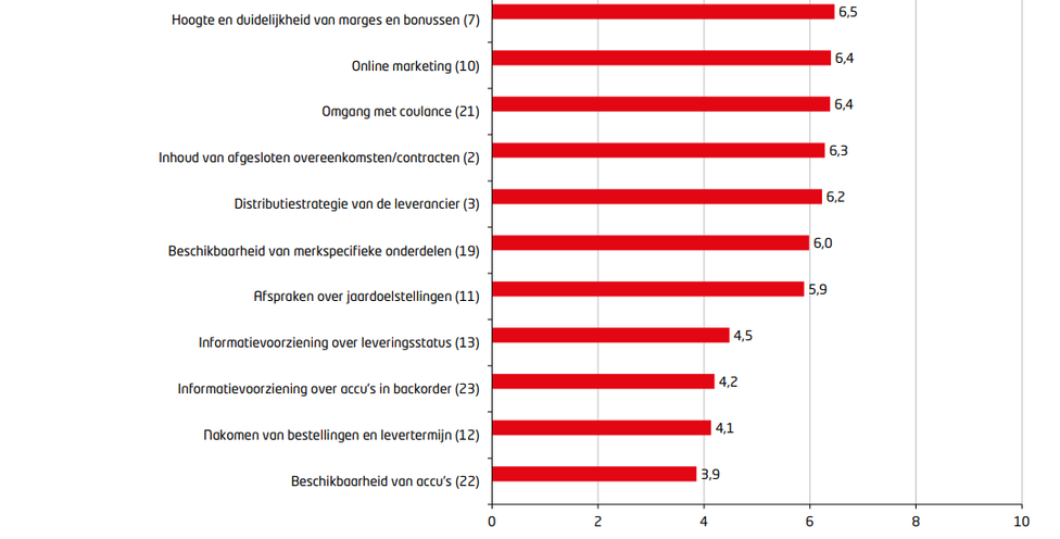De laagste waardering wordt gehaald op de beschikbaarheid van accu’s. Dit is probleem wat al langer speelt voor fabrikanten en dealers. Met name de onduidelijkheid over de levertijd is voor veel dealers een pijnpunt. Betere informatievoorziening vanuit de fabrikant zou hierbij helpen.