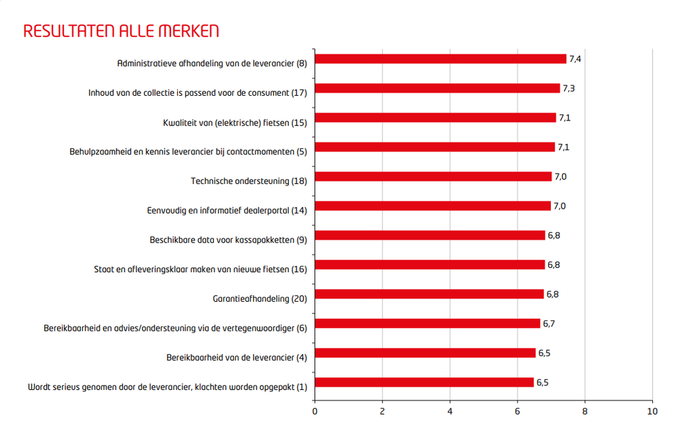 Het meest tevreden zijn de dealers over de kwaliteit van de fietsen en de administratieve afhandeling door de leverancier. Ook zijn dealers over het algemeen zeer tevreden over de productontwikkeling van de fabrikanten. De collectie past bij de wensen van de klant.