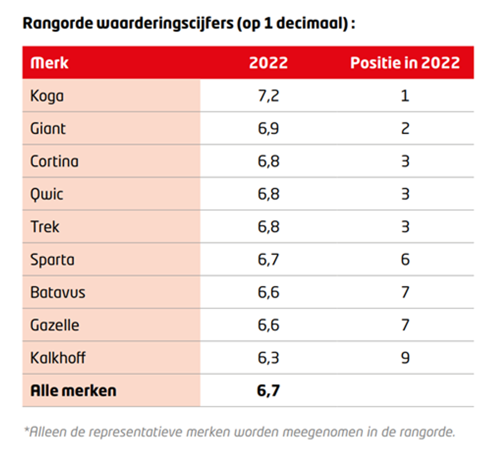 Vooropgesteld, de resultaten van RODI Fiets 2022 zijn niet 1 op 1 vergelijkbaar met vorige edities door een gewijzigde onderzoeksopzet. Voorheen werd de waardering uitgedrukt als gemiddelde van alle algemene rapportcijfers. Nu zijn de cijfers die uit stellingen volgen ook mede bepalend (50%), naast het gemiddelde van het algemene rapportcijfer (50%). Daardoor weegt bijvoorbeeld de problematiek van acculeveranties zwaarder mee met het waarderingscijfer.